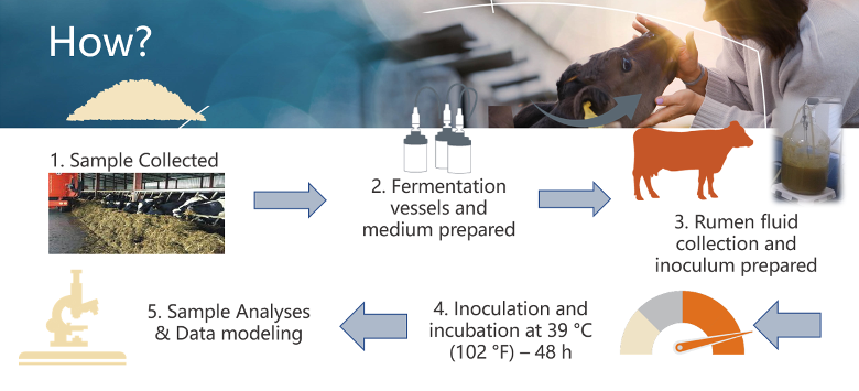 Wet chemistry and NIR provide accurate nutrient concentrations and remain essential for ration formulation, with wet chemistry serving as the calibration standard. In situ analysis plays a vital role in research, advancing understanding of digestion kinetics and informing dynamic feed models. In vitro gas fermentation extends this knowledge by characterizing digestion rates and partitioning substrates into fast and slow pools. Together, these approaches complement one another: wet chemistry and NIR quantify feed composition, while in situ and in vitro techniques reveal biological availability and fermentation dynamics. Integrating these tools enhances the precision of ration formulation, improves nutrient efficiency, and supports both economic viability and environmental sustainability. Looking forward, continued development in predictive modeling, machine learning calibration, and precision feeding systems will help bridge laboratory analyses with on-farm decision making.